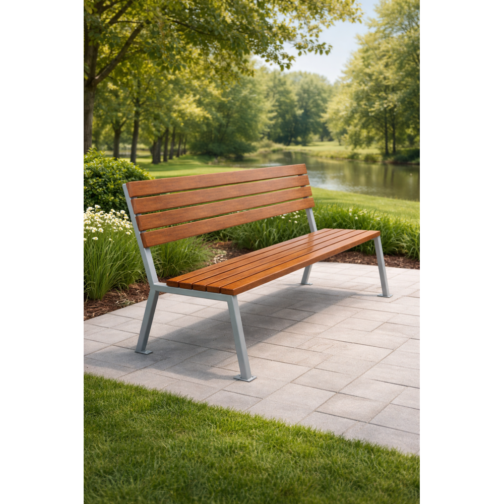 Lavička s opěradlem Harmony kombinuje pevnou kovovou konstrukci a dřevěné latě pro pohodlné...