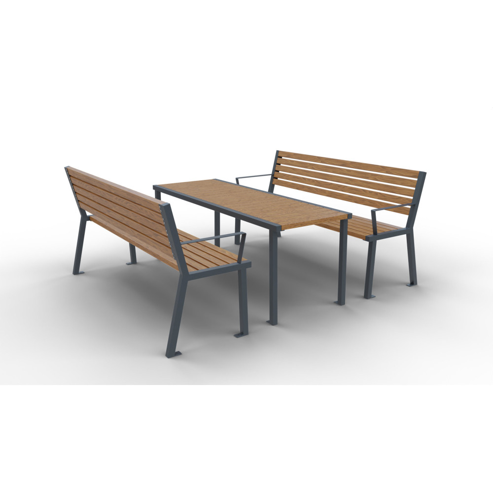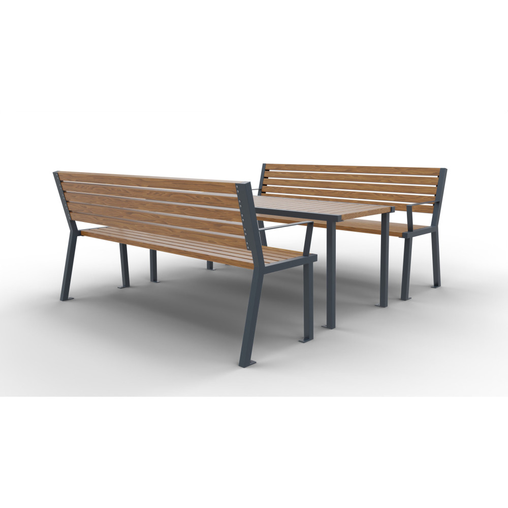 Parková sestava Bolzano III (stůl + 2× lavička s područkou) kombinuje moderní ocelovou konstrukci s přírodním vzhledem dřeva. Stabilní a odolné řešení pro terasy, zahrady i venkovní posezení u kaváren či restaurací.