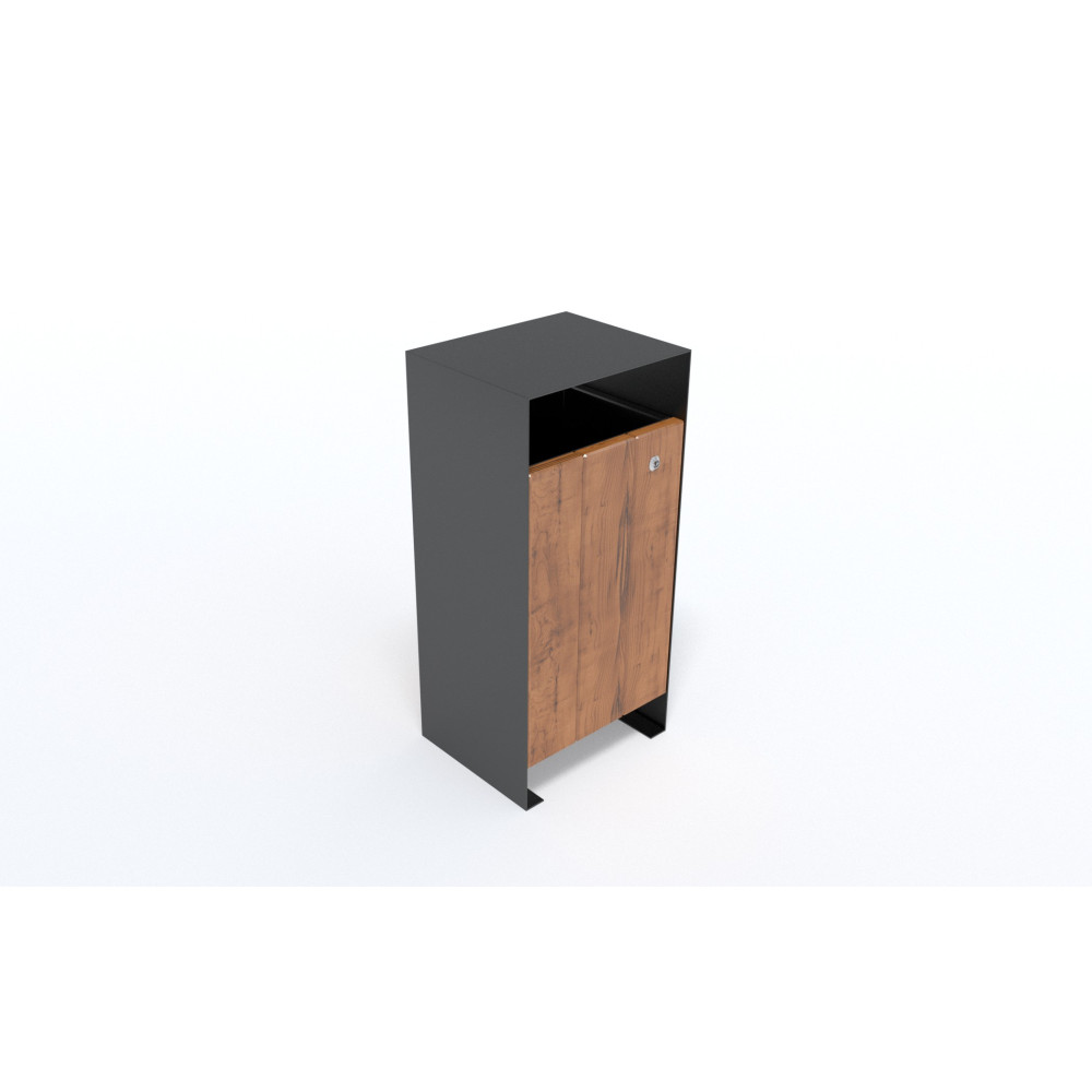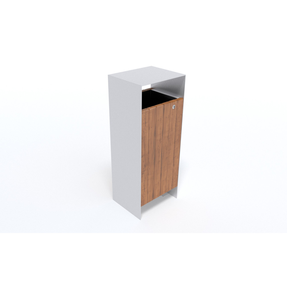 Odpadkový koš Thor je robustní a přesto elegantní konstrukce jednoduchého tvaru a provedení. V ocelovém plášti koše jsou z přední strany umístěna otvíratelná uzamykatelná dvířka v provedení z dřevěnou výplní, skrývající vyjímatelnou nádobu s pozinkovaného plechu.