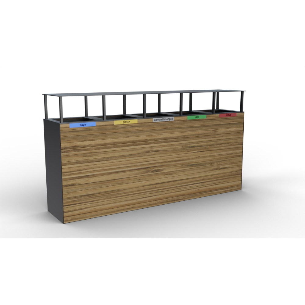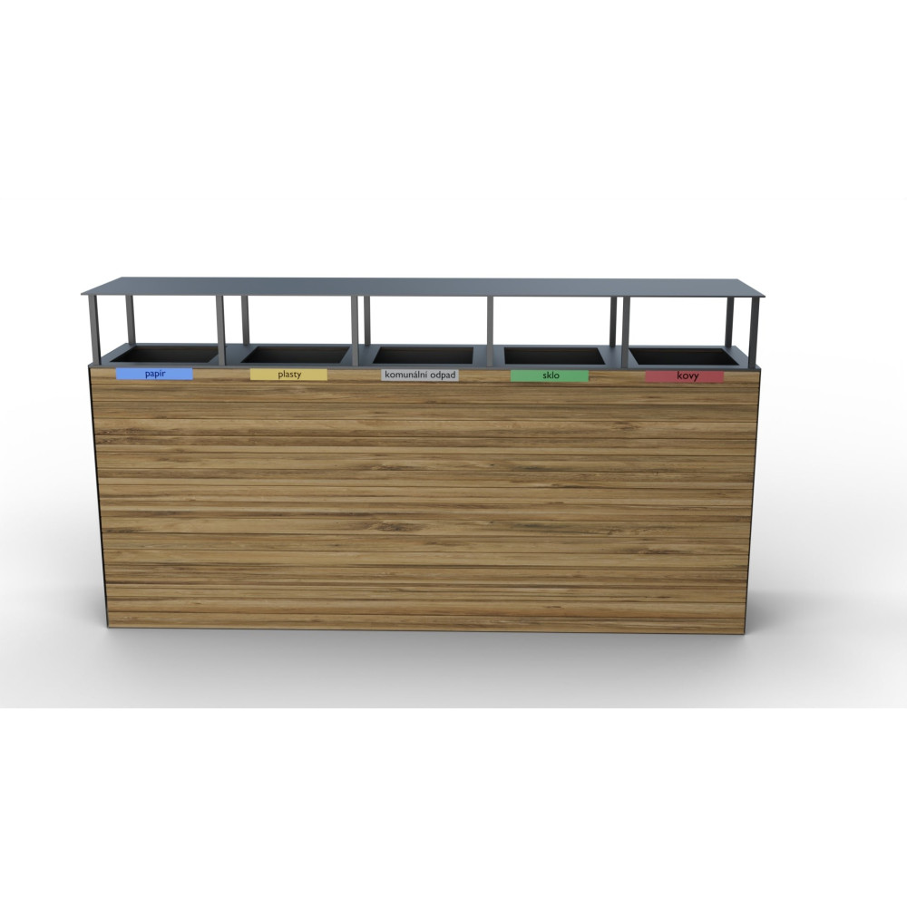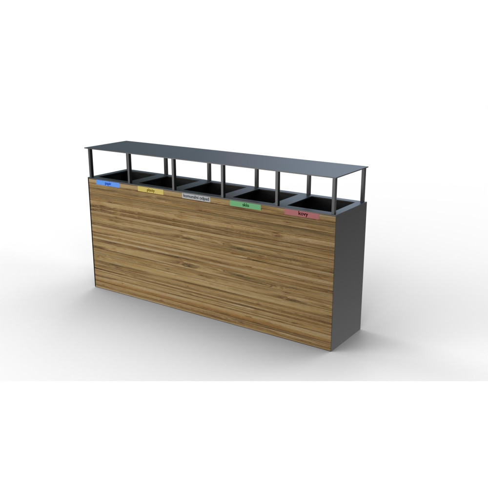 Venkovní odpadkový koš na tříděný odpad Pera VI s dřevěným pláštěm a výklopnou stříškou. Koš je vybaven vyjímatelnými pozinkovanými vložkami na odpad o objemu 5 x 65L