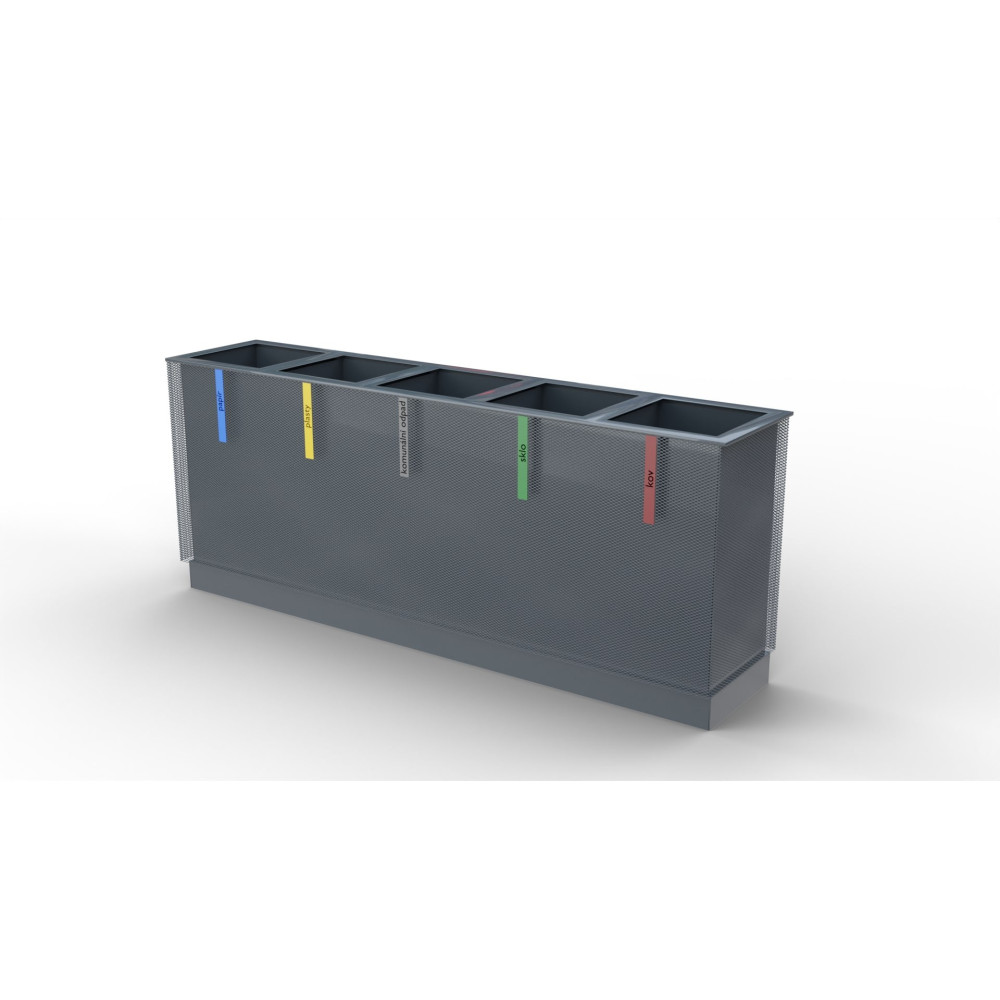 Venkovní odpadkový koš na tříděný odpad Metal VII s ocelovým obložením koše. Koš je vybaven vyjímatelnými pozinkovanými vložkami na odpad o objemu 5x 65L