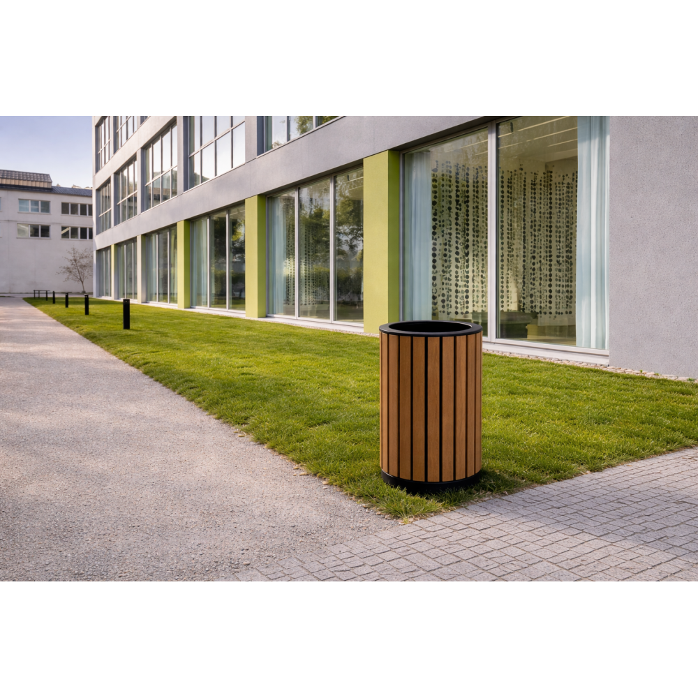 Odpadkový koš Big I představuje moderní řešení pro čisté a esteticky upravené veřejné i soukromé prostory. Kombinace pevné kovové konstrukce a stylového dřevěného opláštění vytváří nadčasový design vhodný do parků, ulic, firemních areálů, škol i rezidenčních projektů.