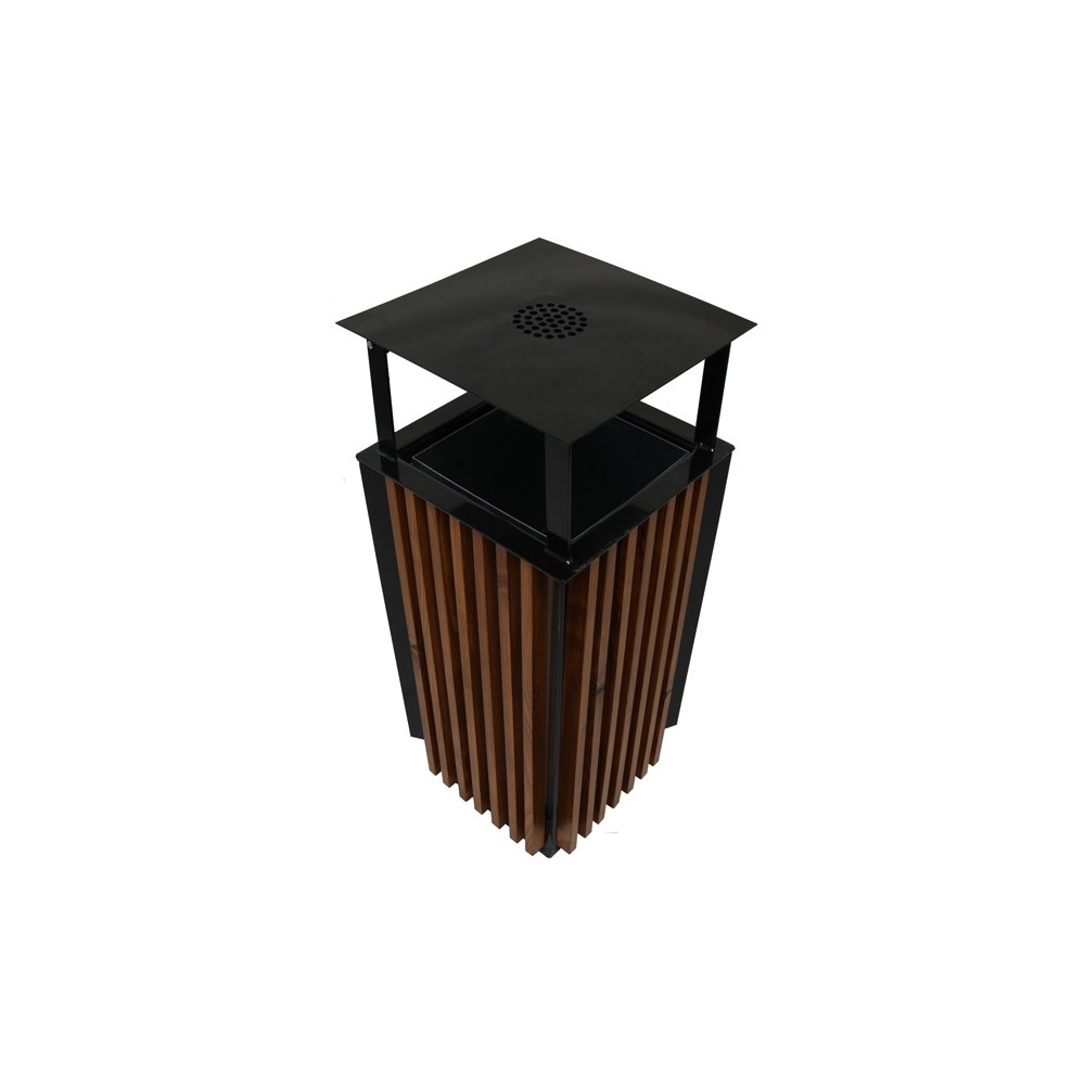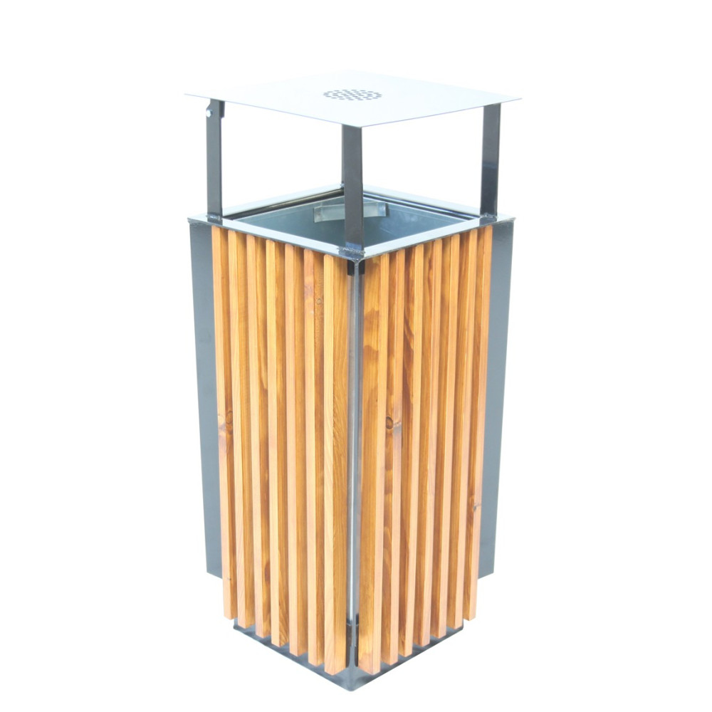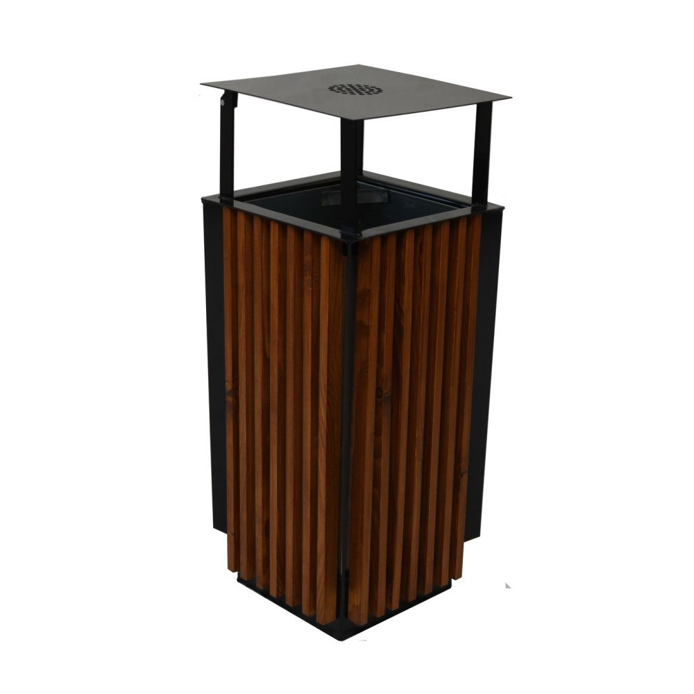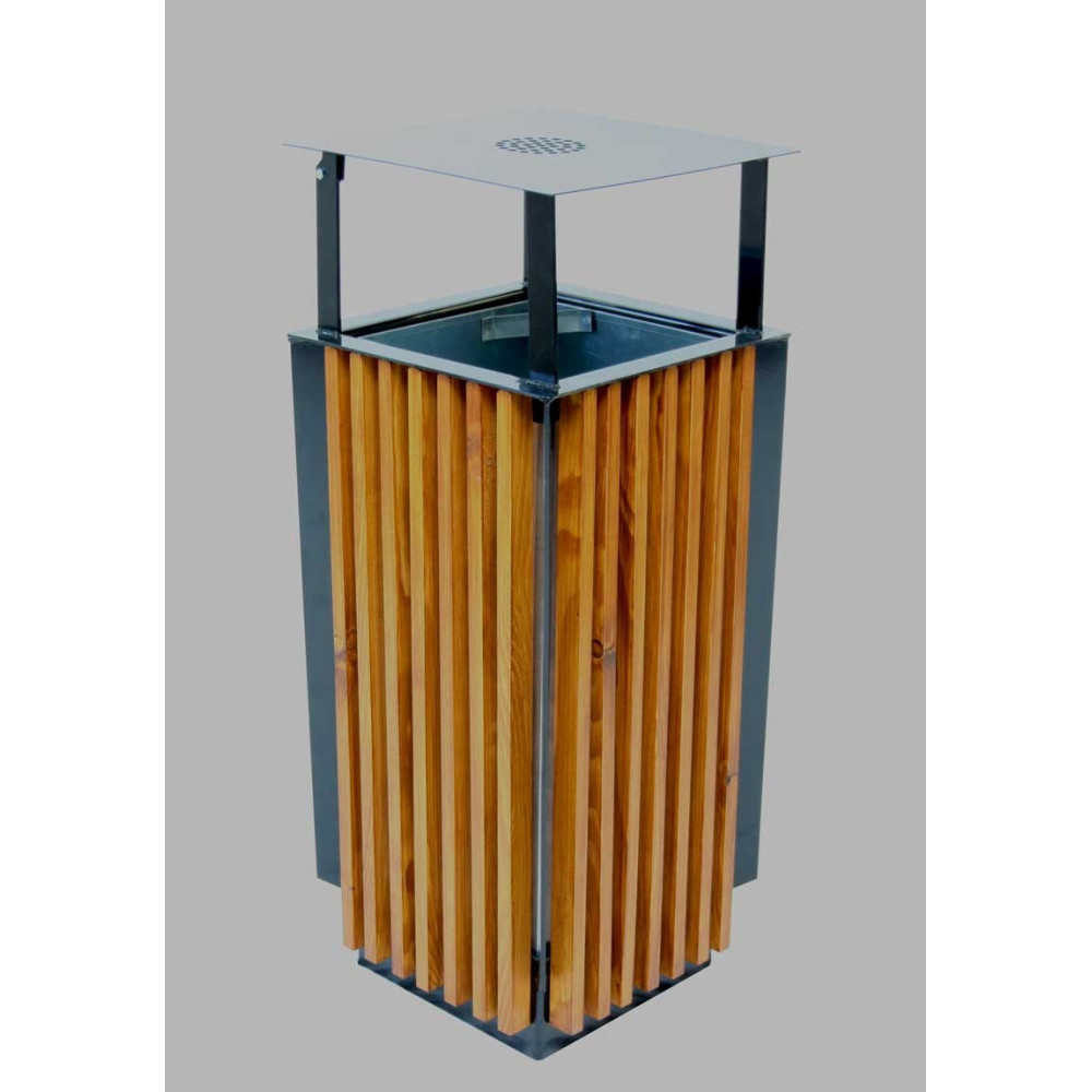 Moderní venkovní odpadkový koš se stříškou o objemu 65 litrů je navržen pro maximální praktičnost a dlouhou životnost i v náročných podmínkách. Díky kombinaci kovové konstrukce a dřevěných lamel působí elegantně a zároveň je velmi odolný.