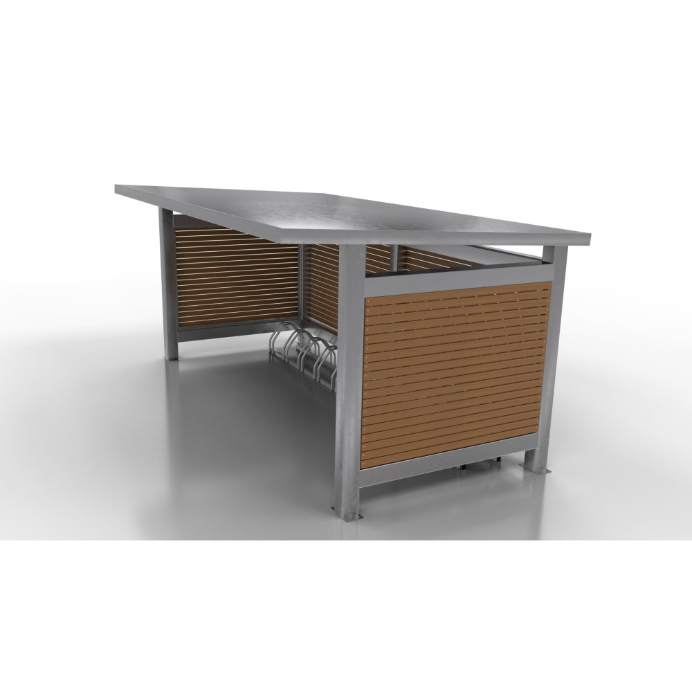 Venkovní modulární přístřešek pro kola Wood z ocelové konstrukce vyplněný smrkovými latěmi pro jakýkoliv veřejný prostor. Součástí dodávky jsou také stojany na kola.