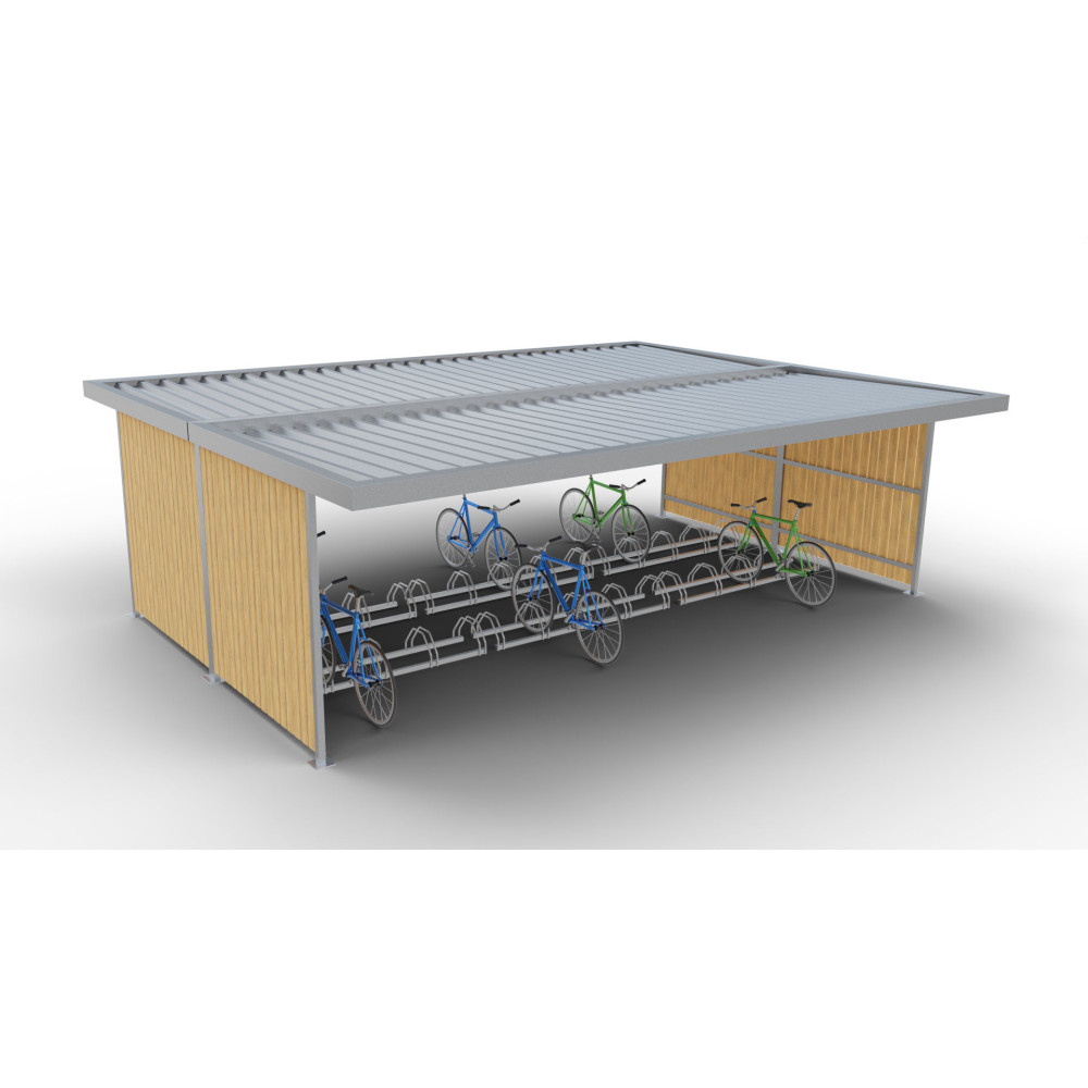 Přístřešek Urban IV pro 20 kol s hlubším půdorysem. Ocel 40×40 mm, svislé dřevěné latě 35 mm,...