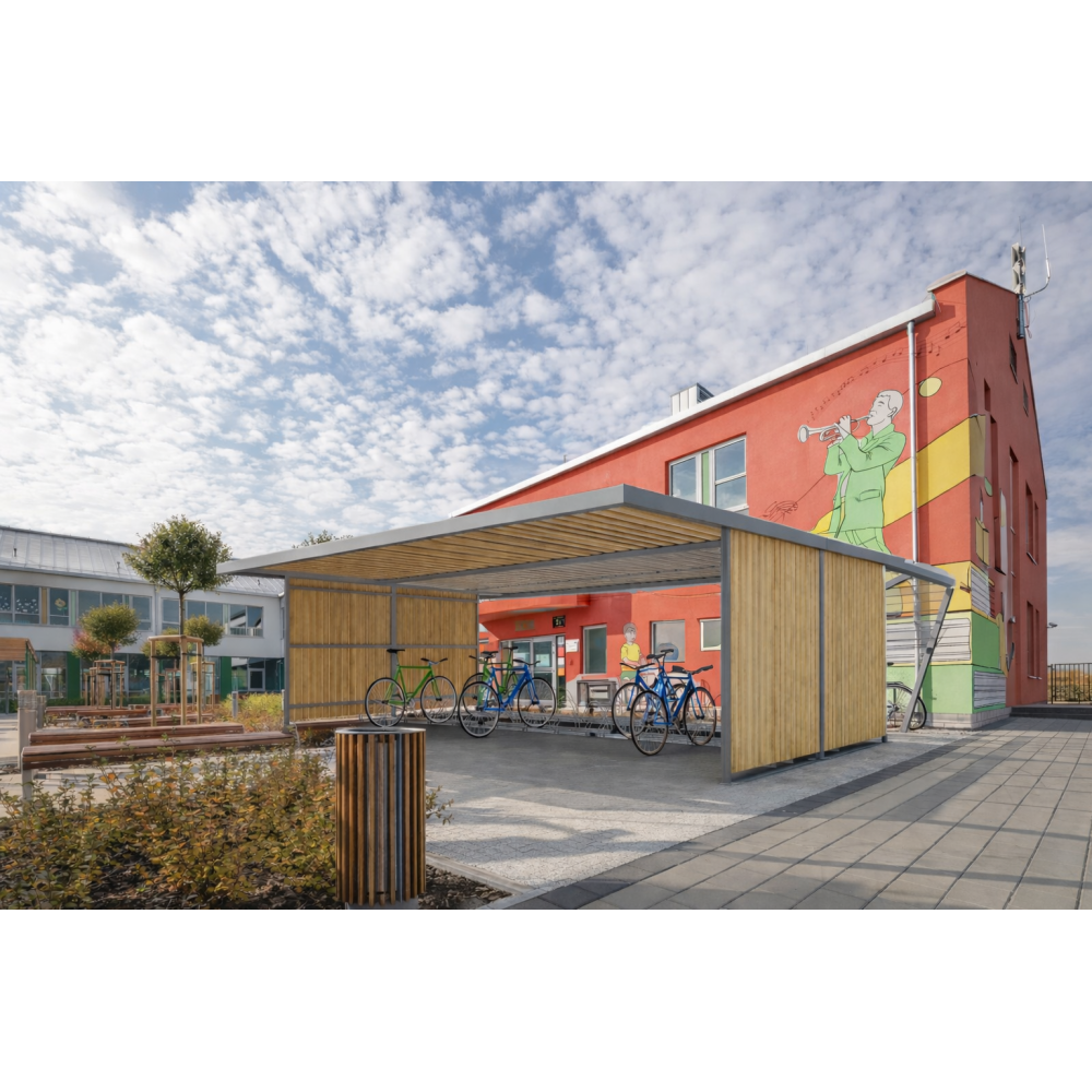 Urban V je přístřešek pro větší kapacity parkování kol. Chrání kola před povětrností, udržuje pořádek a díky svislému obkladu působí moderně v městském i rezidenčním prostředí. Integrované stojany umožní organizované parkování.