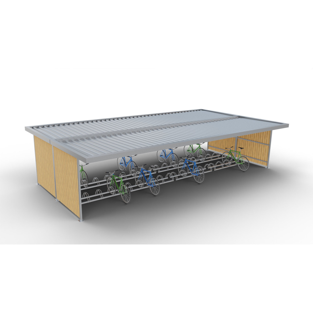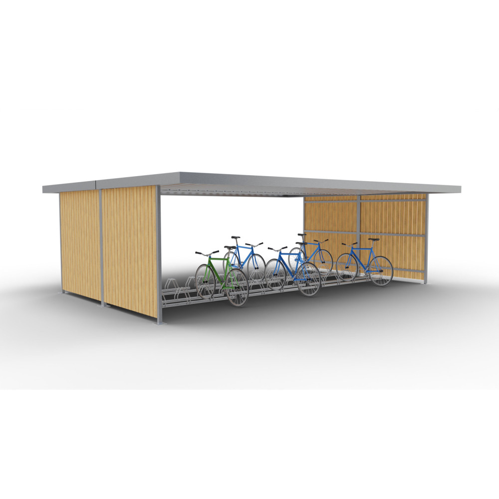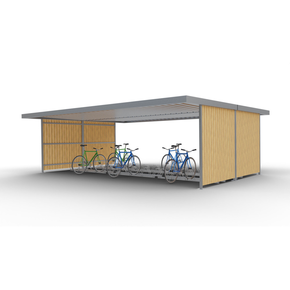 Přístřešek Urban III pro 20 kol s moderním svislým dřevěným obkladem. Ocel 40×40 mm, střecha...